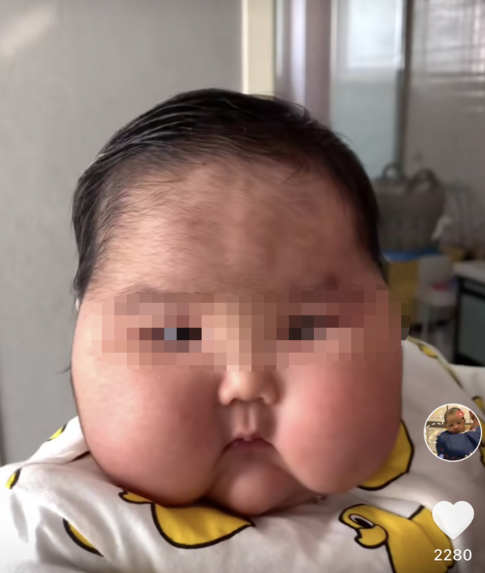只有6个月大的柚子宝宝,体重已经达到22斤,脸颊的异常凸起让她看起来像被吹鼓的气球。