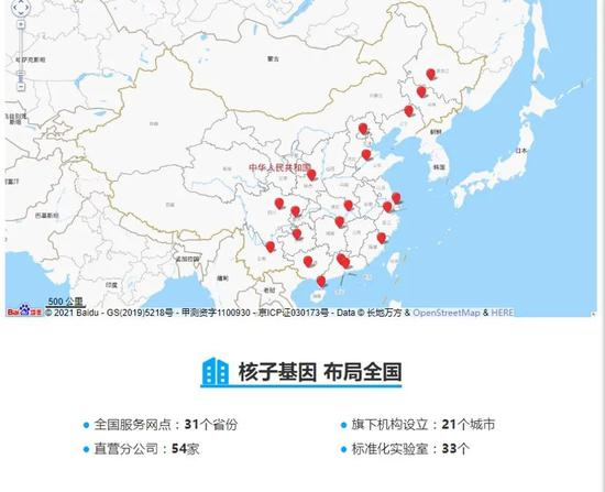 在业务上,核子基因主要提供司法鉴定、健康管理、医学检验、科研服务的业务。官网显示的布局中,“核子基因服务网点遍布全国,并已在全国直营分公司有54家、33个标准化实验室”。