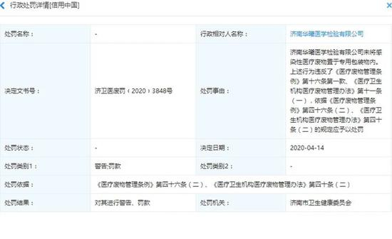 根据企查查显示,济南华曦医学检验有限公司因未将感染性医疗废物置于专用包装物,违反了《医疗废物管理条例》第十六条第一款、《医疗卫生机构医疗废物管理办法》第十一条(一),依据《医疗废物管理条例》第四十六条(二)、《医疗卫生机构医疗废物管理办法》第四十条(二)的规定应予以处罚,济南市卫健委在2020年4月14日对该公司采取对其进行警告、罚款的处罚。