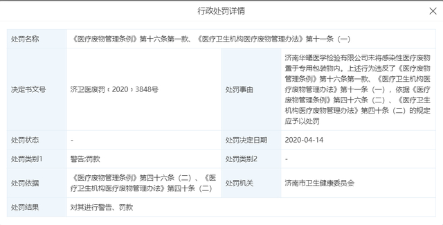 值得一提的是,天眼查官网信息显示,2020年4月,济南华曦因未将感染性医疗废物置于专用包装物内,被济南卫健委警告、罚款 。上述行为违反了《医疗废物管理条例》第十六条第一款、《医疗卫生机构医疗废物管理办法》第十一条(一),依据《医疗废物管理条例》第四十六条(二)、《医疗卫生机构医疗废物管理办法》第四十条(二)的规定应予以处罚 。