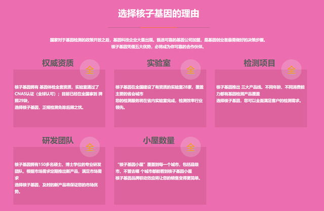 在招募加盟商的页面中,核子基因还介绍其在全国建设了有资质的实验室28家,拥有150多名硕士、博士学位的专业研发团队。