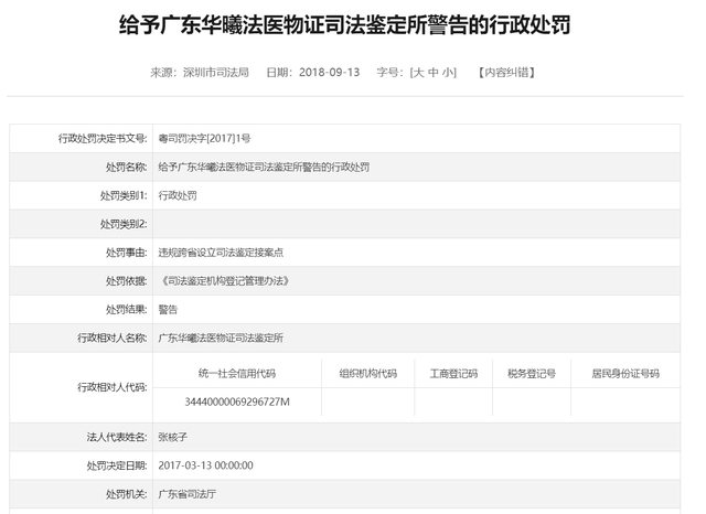 2017年,核子基因旗下的广东华曦法医物证司法鉴定所,就曾经因为违规跨省设立司法鉴定接案点,被广东省司法厅警告。