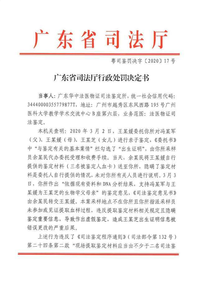 根据2020年广东省司法厅的行政处罚书,由于根据孩子母亲自行提供的鉴定材料,做出虚假“亲生”鉴定,造成孩子的出生信息被错误更改,广东华中法医物证司法鉴定所被停止从事司法鉴定业务三个月。
