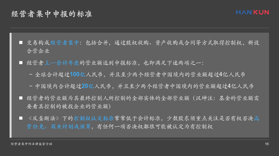 另外一点,什么叫“取得控制权”?因为营业额是基于整个集团的,所以被集团控制的所有企业的营业额都会算在这个数字里边。“控制”这个词在反垄断法下,涵盖的范围是很广的,除了直接股权控制、管理控制以外,还有就是在少数股东对公司的高管任命、商业计划、预算,任何一项有否决权,也会被认为是控制。