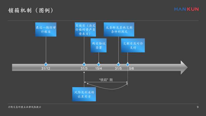 这里面有一种“锁箱机制”,即大家商量一个时点,在那个时间点公司是什么样价值,就固定下来了,在交易后续发生过程中不做任何调整,这也算是一种固定价格。当然这种做法是把风险和利益不确定性放到了买方,是对卖方更好的一种机制。