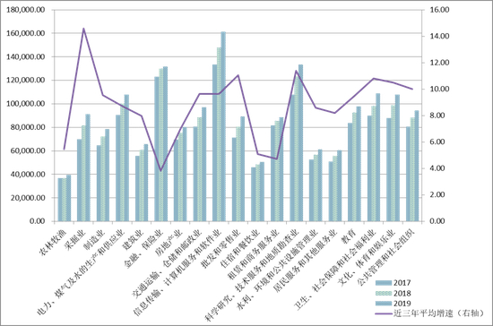图3 近三年城镇非私营单位项下不同行业平均工资及增速情况