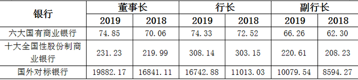 表1 国内外银行董事长、行长和副行长薪酬水平对比