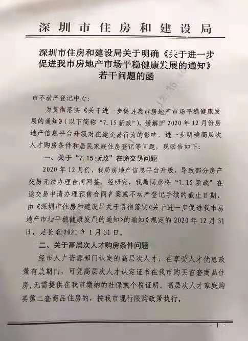 今日在网上流传的函件还提到,由于2020年12月,深圳住建局房地产信息平台升级,导致部分房产交易无法办理合同网签。因此,函件提到,“715新政”在途交易预售合同备案或不动产登记手续截至日期,由原规定的2020年12月31日,延长至2021年1月31日。