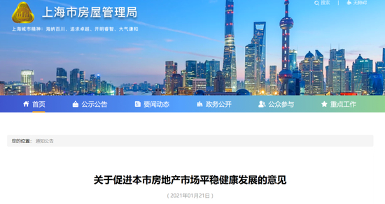 经上海市政府同意,上海市住房和城乡建设管理委员会、市房屋管理局、市规划和自然资源局、市财政局、市税务局、人民银行上海分行、上海银保监局、市市场监督管理局联合印发《关于促进本市房地产市场平稳健康发展的意见》(以下简称《意见》),自2021年1月22日起实施。
