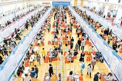 江苏淮阴师范学院学生在招聘会上挑选岗位。