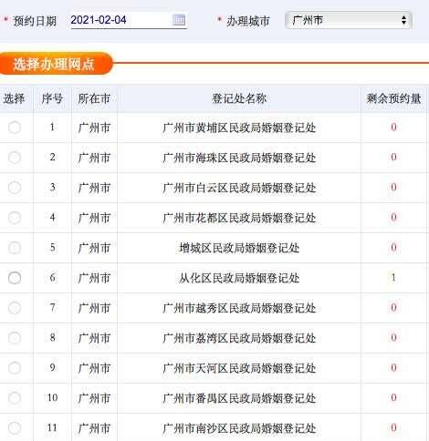 2月2日20时许,记者登录“广东民政婚姻登记网上预约系统”查看离婚预约发现,从2月4日至28日的25天中,除了春节放假7天,广州11个行政区可预约到的有14天(节前有5天,节后有9天),不过多数分布在离市区较远的花都区、增城区、番禺区、从化区。记者粗略统计了一下,剩下可预约量为150个。节前的周末都是剩余量为“0”;节后可选择的区多一些,不乏越秀区、海珠区、荔湾区等中心城区的婚姻登记处。