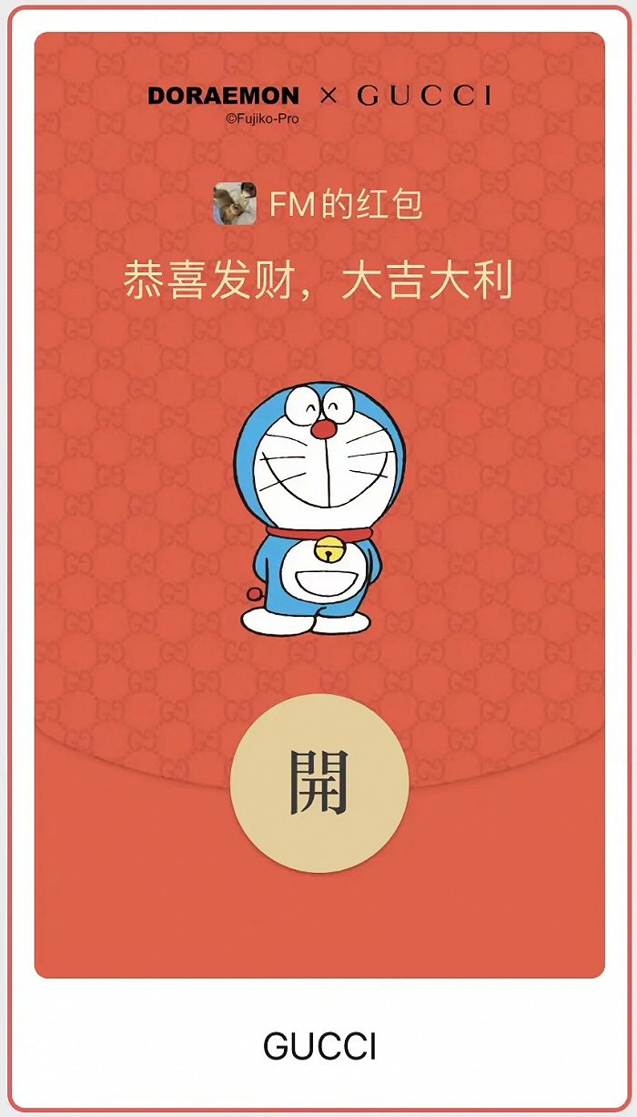 此外,在定制红包封面可直接连接品牌公众号的设定下,品牌方可以在“红包满天飞”的春节为官方账号带来一波强势导流,也可借助主题红包实现对具体商品的导流,如Gucci在今年分发了哆啦A梦和迪士尼主题红包封面,而该品牌在此前曾推出过相关主题联名款服装。