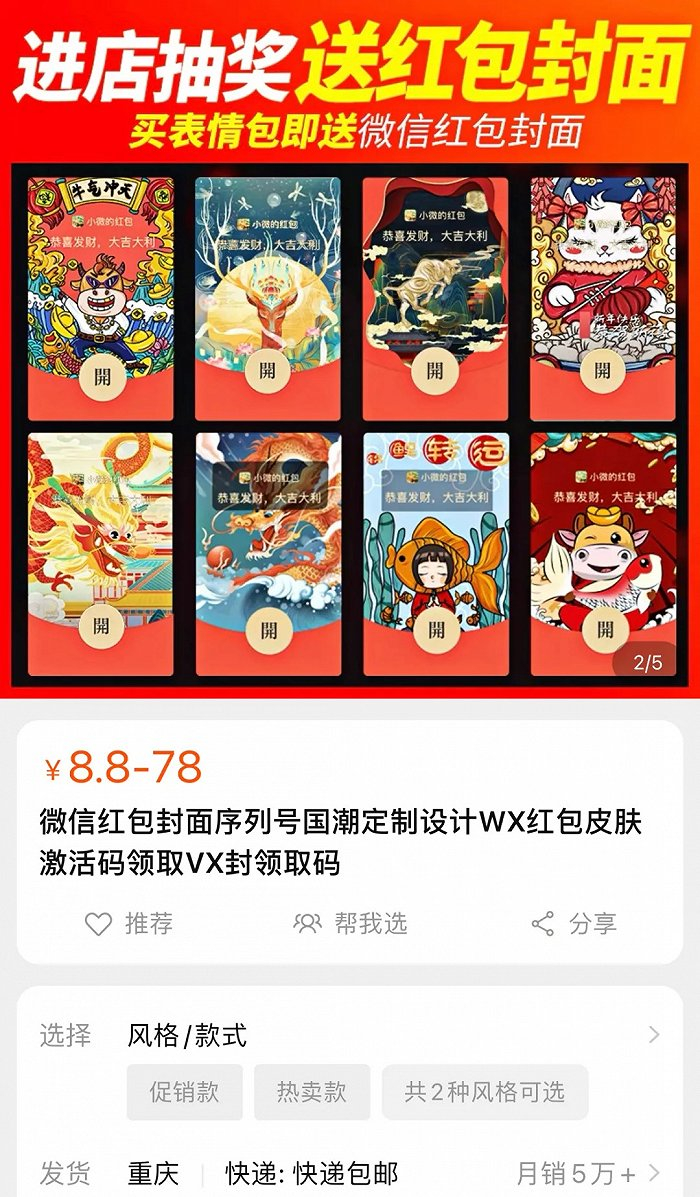 不过,因微信定制红包封面的有限期仅有三个月时间,多数用户对其的定位为“可重复消耗品”,且淘宝平台售价并不高,因此虽有下架风险,但仍有不少用户会选择重复购买。
