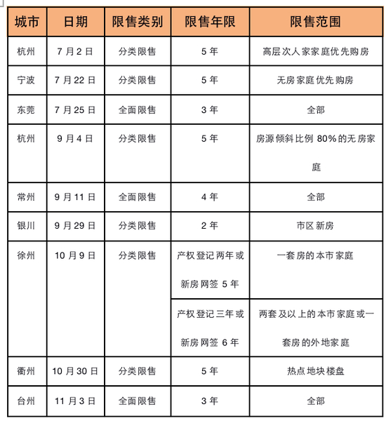 其中东莞、台州、常州为全面限售,限售年限分别为3年、3年和4年,其他城市为分类限售。从限售年限看,最低限售两年,最高限售五年。限售五年的情况针对部分房源和地块,如杭州的高层次人才购房及无房家庭房源倾斜比例超80%的项目,宁波的无房家庭优先认购、衢州热点地块楼盘等。