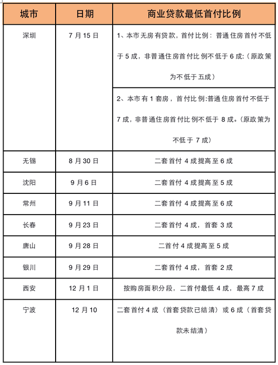 2020年7月以来,共有9城出台限贷政策,主要聚焦于首付比例的规定上。从最低首付比例看,长春、银川二套首付最低4成,属调控最松城市。沈阳、唐山二套最低首付由4成变5成,无锡常州二套最低首付由4成变6成,属限贷较严的城市。深圳、西安、宁波对二套首付比例有细分要求,其中西安限贷政策细分程度最高,深圳限贷最严厉,对普通住房和非普通住房实行差别化信贷政策,二套商贷首付最低比例可高至8成。