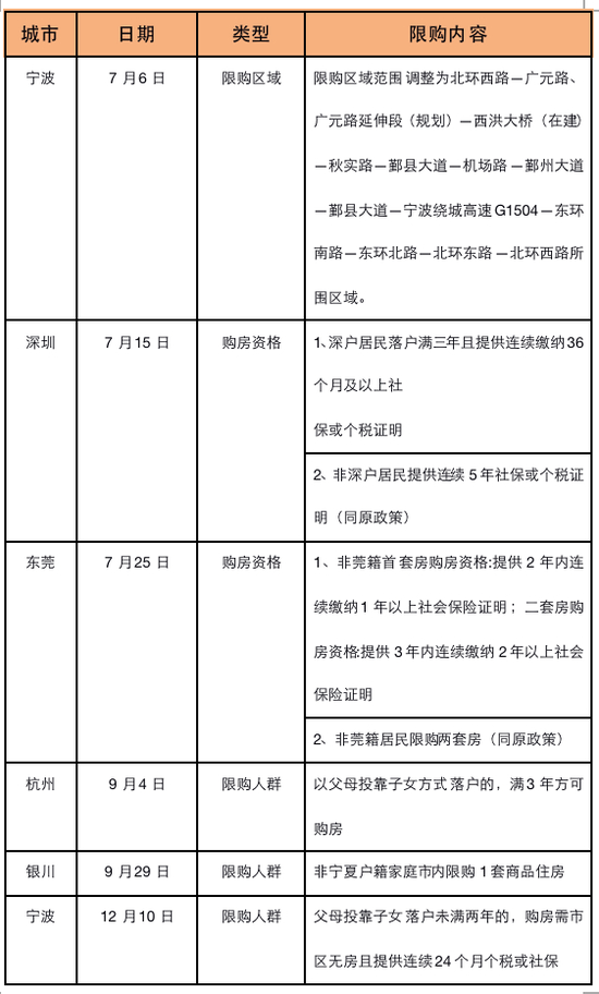 整体上,东莞限购升级主要在购房资格认定上有收紧,之前缴纳个税也可作为购房资格的认定,本次调整规定只认社保缴纳证明。宁波扩大城区限购范围、对特殊人群细化购房资格认定,东莞和深圳在购房资格认定上有新规定,杭州和银川的限购聚焦于人群方面。