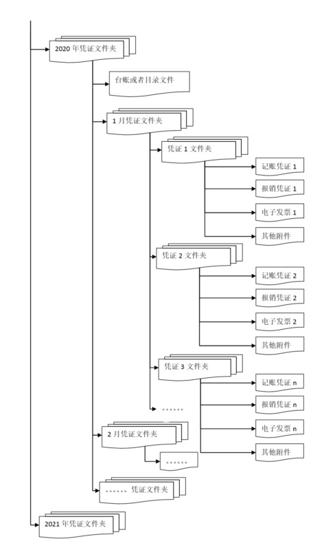 无电子档案管理系统的单位,如实施了会计信息系统,与电子发票相关的记账凭证、报销凭证等已全部实现电子化,可将电子发票与相关的记账凭证、报销凭证等移交会计档案管理人员保存,编制档号,存储结构建议采取下图所示方式: