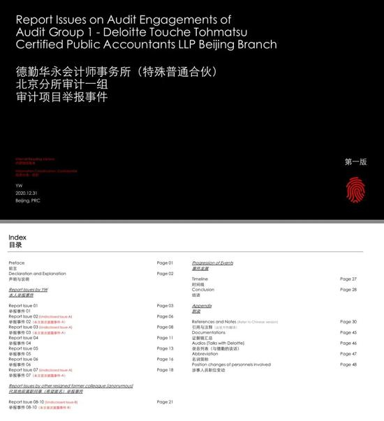 YW 是我在德勤的代号,已经跟随了我四年多。但是这个名字已经有两年多没有出现在德勤任何项目的底稿签名中了, 而很快,它也将消失在德勤的系统中。以这样的方式和大家见面,我很抱歉。作出公布这份举报材料的决定,我想了很 久,因为它的出现,会影响到公司里某些人的名誉、利益、甚至前途。但它的出现,也一定会帮助更多的人。