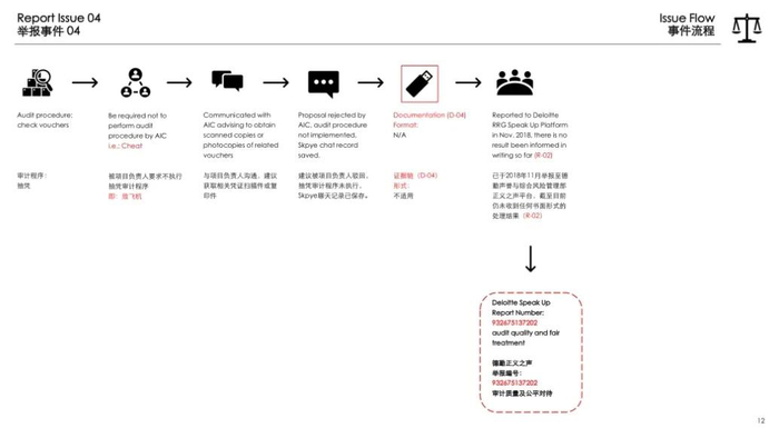 上述两起事件,均发生在德勤北京分所审计一组。近日,该组一位代号“YW”的员工,在公司内部发布了一则举报邮件。在长达50多页的中英文双语PPT中,“YW”详细列举了自己从2016年入职以来,在工作中经历的种种不合规、不合理事件,并附上各种证据,罗列出了相关准则规范。
