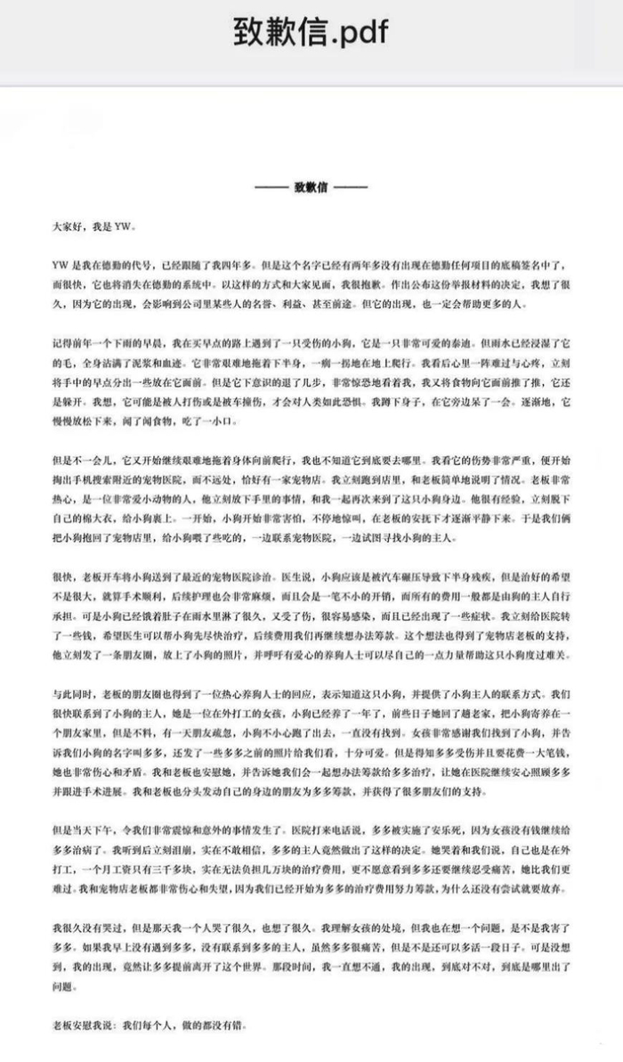 与举报PPT一同流出的,还有一封致歉信,“YW”花了很大的篇幅,讲述了一个自己救助受伤流浪狗的事情。因为没有足够多的钱继续为狗治病,流浪狗被安乐死。致歉信的最后,“YW”提到,“追求公平、正义、真理,是永恒不变的普世价值。而审计职业操守,更是所有审计从业者们最低的道德准绳。如果连最后的底线都无法守住,那么我们的审计工作将变得毫无价值。”