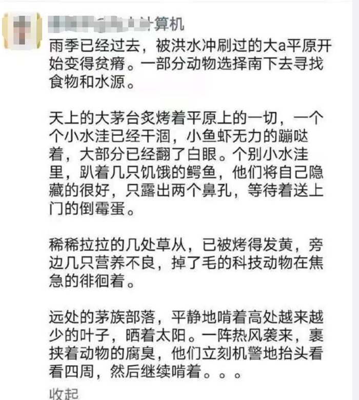 还有券商分析师师在朋友圈写了一篇,文中称,“天上的大茅台炙烤着平原上的一切,一个个小水洼已经干涸,小鱼虾无力得蹦跶着,大部分已经翻了白眼。个别小水洼里,趴着几只饥饿的鳄鱼,他们将自己隐藏的很好,只露出两个鼻孔,等待着送上门的倒霉蛋。”
