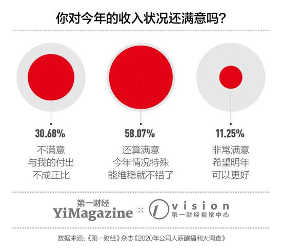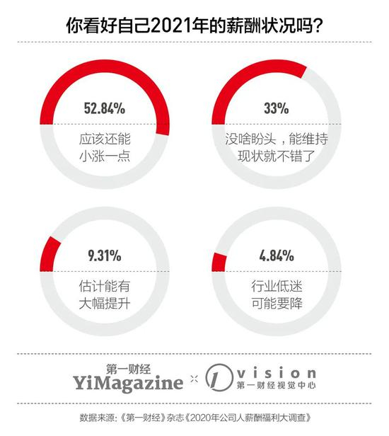 相应地,公司人对2021年薪酬的预计并不算乐观。《调查》显示,52.84%的受访者认为自己2021年的薪酬“应该还能小涨一点”,33%的人觉得“没啥盼头,能维持现状就不错了”。这两个数字在2019年的调查中是56.22%和29.44%。