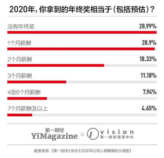 根据前程无忧的《2020年终奖调查报告》,在2019年时,22.5%的受访者拿到了相当于一个月薪酬的年终奖,而41.8%和21.4%的受访者年终奖相当于两个月和三个月薪酬。而到了2020年,能拿到两个月及以上薪酬的公司人减少了15.3%,与此同时,拿到一个月薪酬水平年终奖的公司人数量则上涨了8.9%。