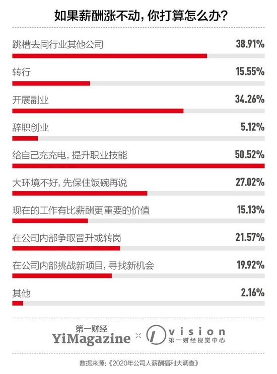 根据《调查》显示,如果薪酬涨不动,高达50.52%的受访者会给自己充电,38.91%的人选择跳槽去同行业其他公司。