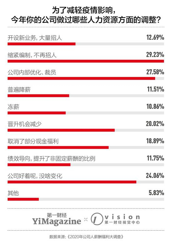 为了缓解疫情的压力,公司们在2020上半年采取多种人力资源措施。《调查》数据显示,“缩紧编制,不再招人”的公司达到29.23%,选择“公司内部优化、裁员”的占27.58%。排名靠前的调整还有晋升机会减少、取消现金福利等。但同时,也有24.06%的人表示“公司好着呢,没啥变化”。