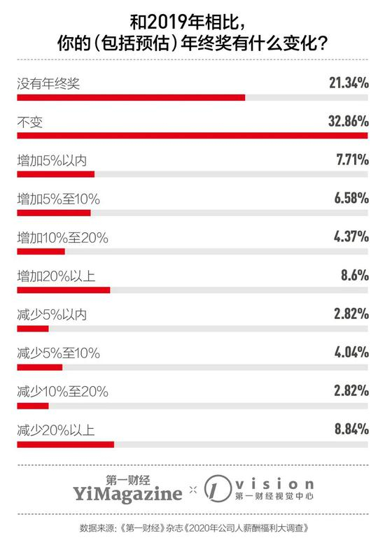 公司人也普遍降低了对2020年年终奖的预期。和2019年相比,32.86%的受访者表示年终奖金额不变,有21.34%没有年终奖。