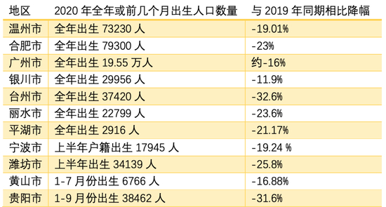 虽然国家统计局今年推迟公布2020年出生人口数据,但根据一些地区已公布2020年全年或前几个月的出生人口数据来看,与2019年同期相比,这些地区出生人口的下降幅度在11.9%至32.6%之间。详细数据见表1: