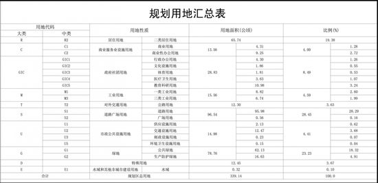 其中大家比较关注的用地布局情况:二类居住用地面积(黄色区域)为65.74公顷,占比19.38%;商业用地和商业性办公用地为13.56公顷,占比4%。