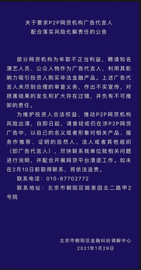 1月29日,北京市朝阳区金融纠纷调解中心微信公众号发布关于要求P2P网贷机构广告代言人配合落实风险化解责任的公告。