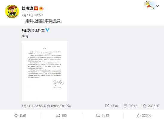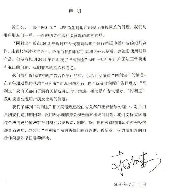 2020年7月11日,杜海涛工作室发布声明称,“网利宝”曾在2018年通过广告代理商与其进行拍摄中插广告的短期合作,未直接签过代言合同,合作前其审核了相关经营资质还注册使用过产品,广告合作早已结束,未再发布过此产品信息。