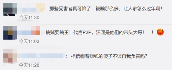 很多受骗的网友在各个平台都表示,当时都是看了汪涵的广告,相信汪涵才把钱放在涉事理财产品中,强调汪涵需要为此事负责。