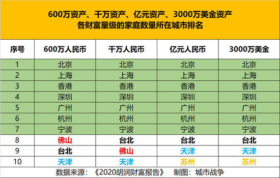 从不同财富量级来看,中国的高净值富裕家庭主要集中在北京、上海、香港、深圳、广州、杭州、宁波、苏州、佛山、台北、天津这几个城市。