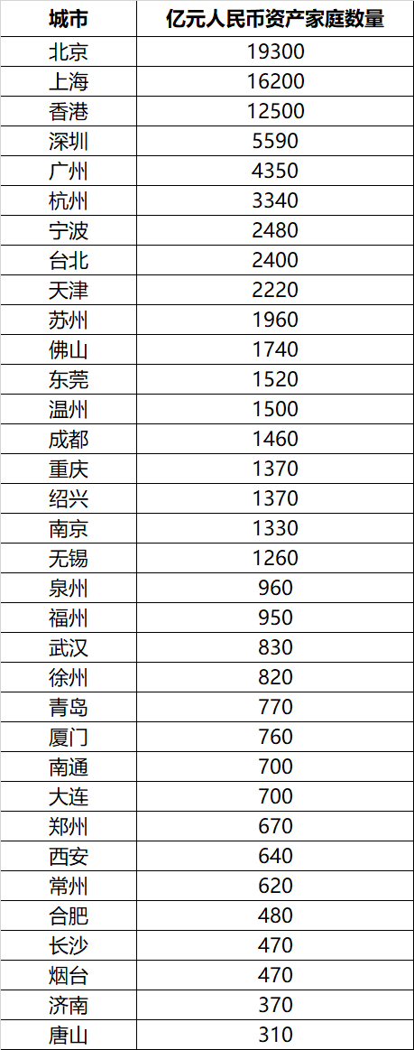 以下是部分城市截止2019年12月31日拥有亿元人民币资产的家庭数量: