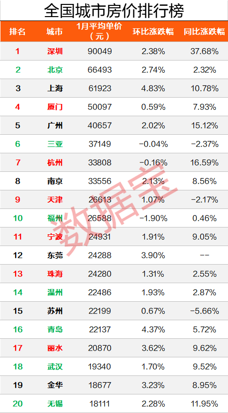 深圳的二手房价同样较高。根据全国房价行情网数据,今年1月份深圳二手房均价突破9万元大关,位居全国第一,达到90049元,同比大涨37.68%。相比较而言,深圳二手房价比北京房价贵35%、比上海贵45%。