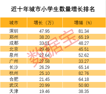 人口大幅净流入,凸显了城市对人才的吸引力,也使得城市更年轻化、更具竞争力。2019年底数据显示,深圳的在校小学生数量突破百万大关,仅次于重庆、广州位居全国第三。从增量来看,深圳在校小学生相比2009年底增长近48万,位居全国第一,增幅81%位居全国第四。