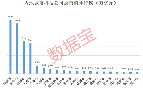 在科技股市值排行榜上,深圳也是位居全国第一位。截至2月10日收盘,注册在深圳的A股、美股、港股的科技公司(美股收盘为2月9日),总市值高达11.85万亿元,超过北京的10.99万亿元,位居全国第一位。深圳的千亿市值科技公司数量同样位居全国前列,合计有15家千亿市值公司,千亿市值科技公司数量仅次于北京。