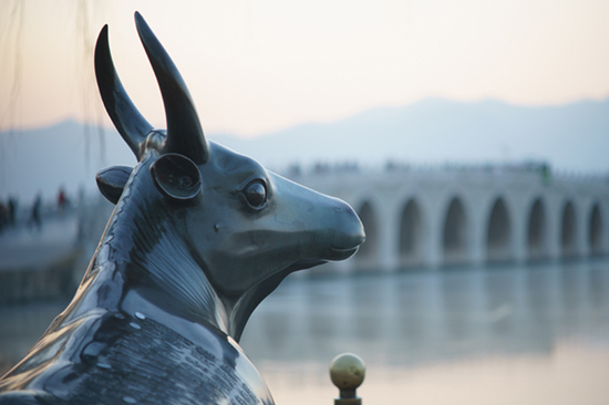 北京颐和园有铜牛,是乾隆皇帝仿大禹“铁牛镇水”故事而铸,牛背有《金牛铭》:“夏禹治河,铁牛传颂。义重安澜,后人景从。”