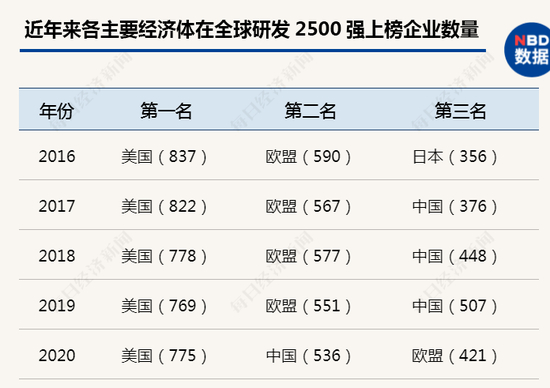 从2017年进入全球研发2500强榜单的前三甲,到2020年,中国已超越欧盟居次席