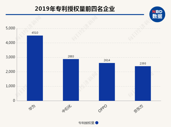 华为在专利授权量上基本持续保持领先位置,其2019年数据比2013年高出一倍