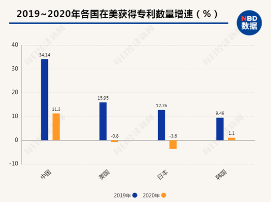 在随后的2019年和2020年,中国继续保持了在美国申请并获得专利的高增长态势,并连续两年成为获得美国专利数量增速最快的经济体。