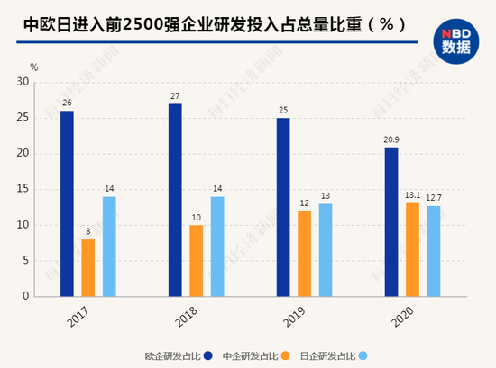 从上述两图来看,尽管2020年中国企业进入全球研发前2500强的数量大幅增加,但研发投入的占比却处于相对劣势;备注:2019年及之前的欧盟数据含英国