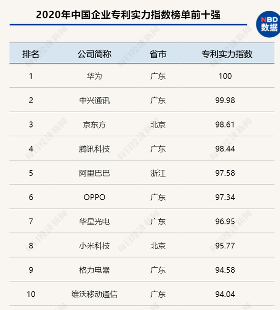而综合平均专利价值、有效发明专利和实用新型专利总数、专利发明人总数、PCT申请总量、专利申请持续时间等指标的2020中国企业专利实力500强榜单则显示,华为、中兴、京东方三家著名科技企业分列排行榜第一到第三位。