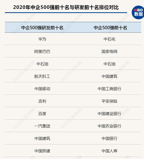 如果我们将2020年中国企业500强中研发投入前十名和中国企业500强前十名进行对比后就可以发现,在两个榜单上同时出现的企业仅有两家(中石油、中国建筑),且他们在两个榜单上的排位基本无法对应。