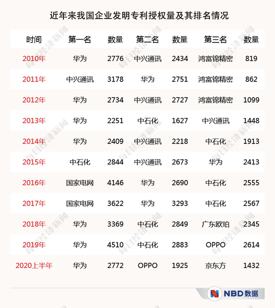 如表格所示,近年来中国企业发明专利授权量逐年上升,2020年仅上半年,排名榜首的华为专利授权量几乎就相当于2010年全年。