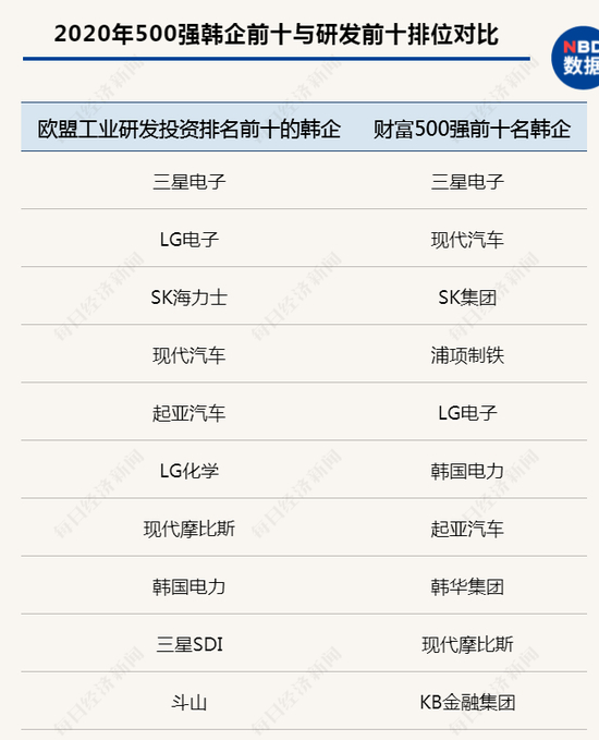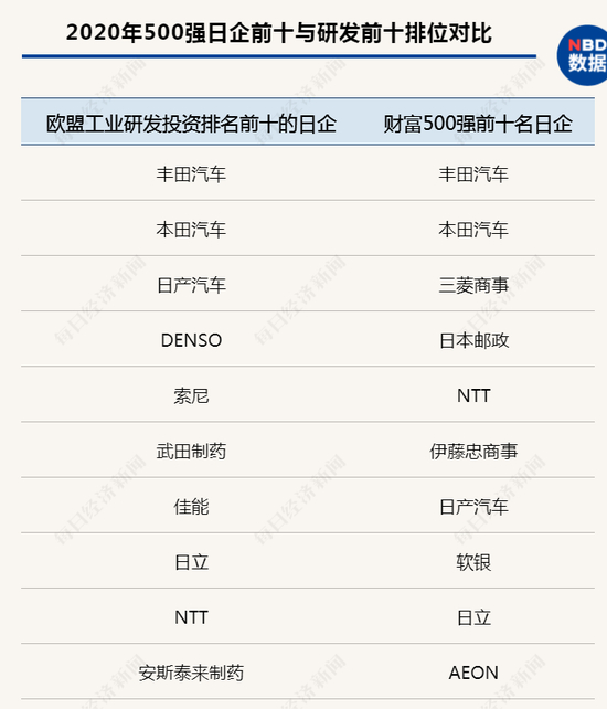 与中企相比,日企和韩国企业研发投入的前十强,同该国在财富500强榜单的前十名很大程度上能形成对应关系