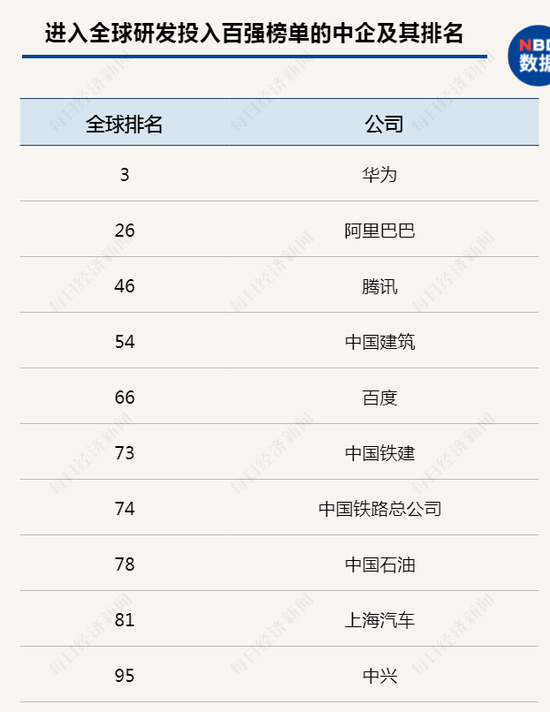在全球研发投入百强榜单中,中国企业占到10个席位